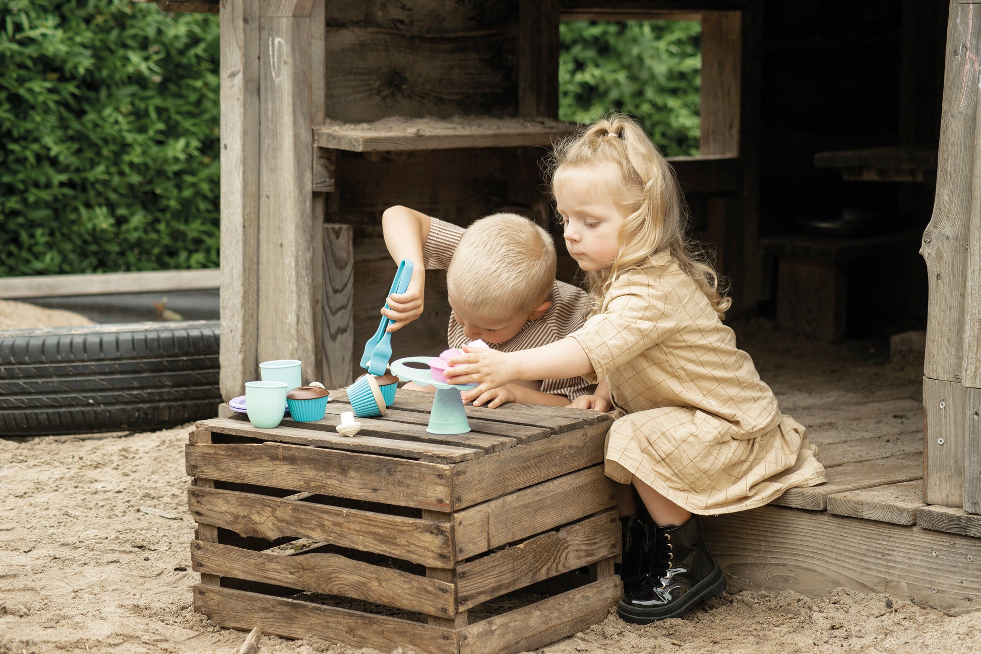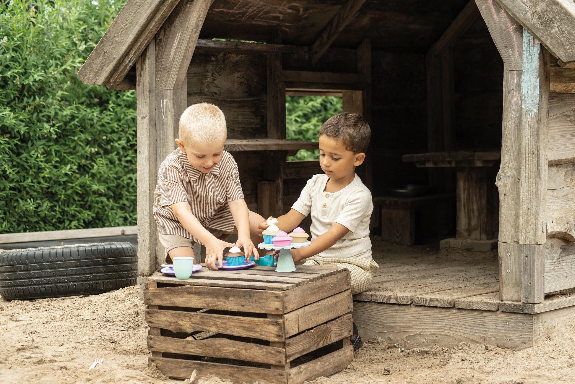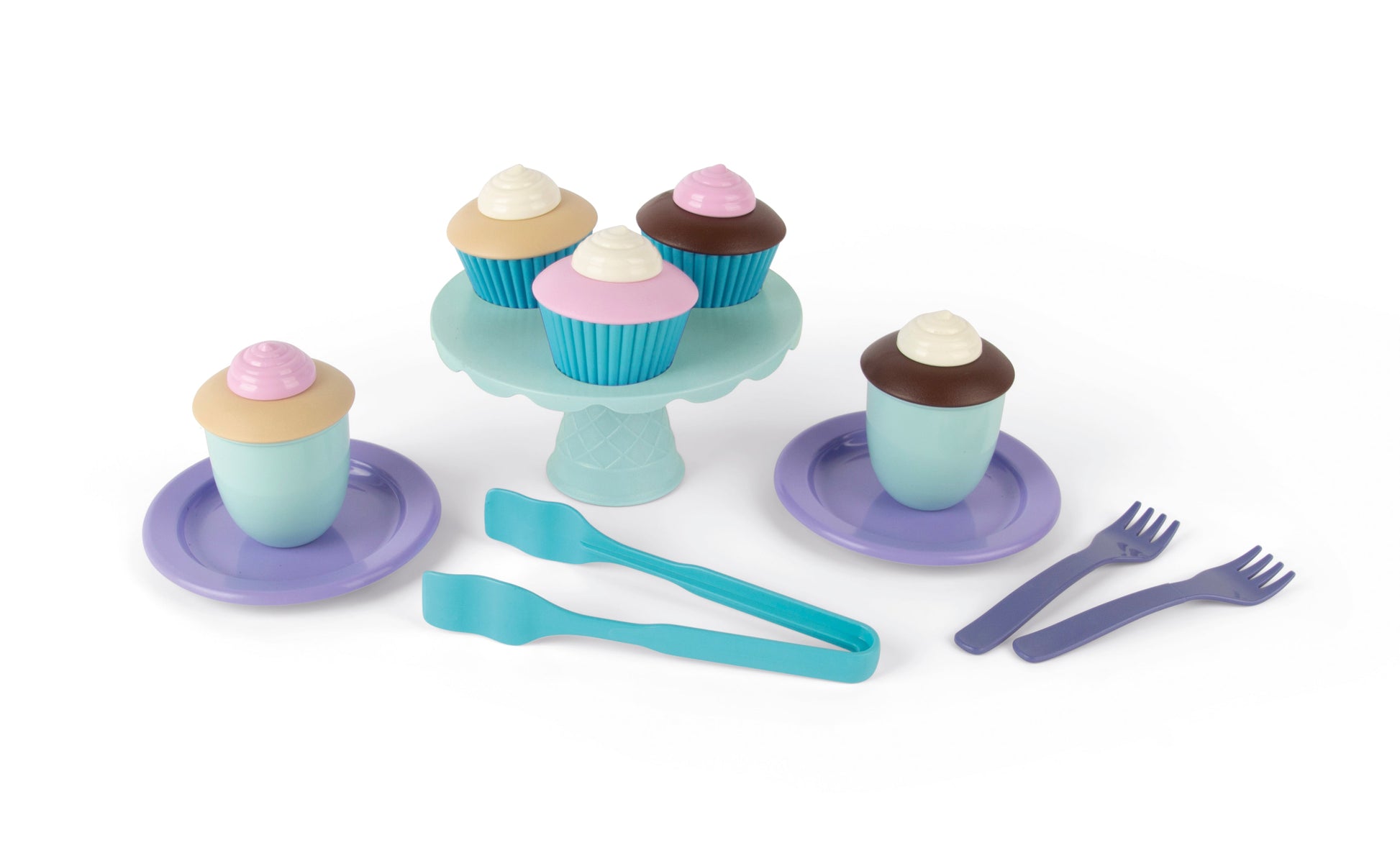 Set aus Kuchen in verschiedenen Farben mit kleinen süßen Toppings in verschiedenen Farben. Kinder können die Kuchen in passenden Muffinförmchen servieren. Teller und Besteck sind im Set enthalten, was zu verschiedenen Rollenspielen einlädt.