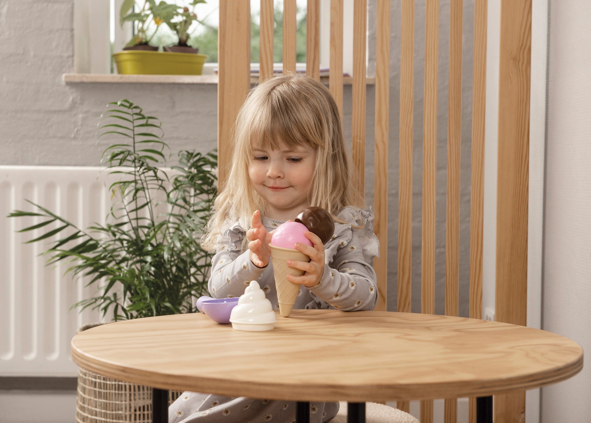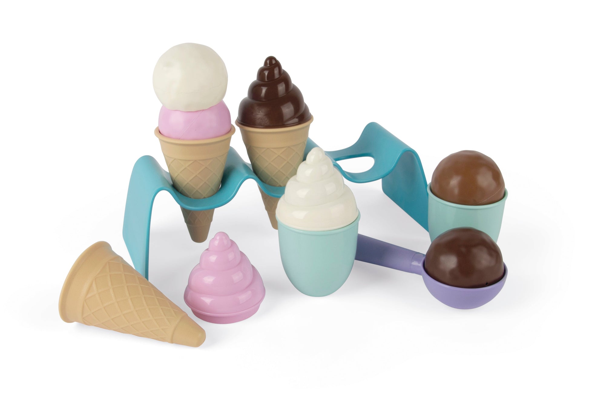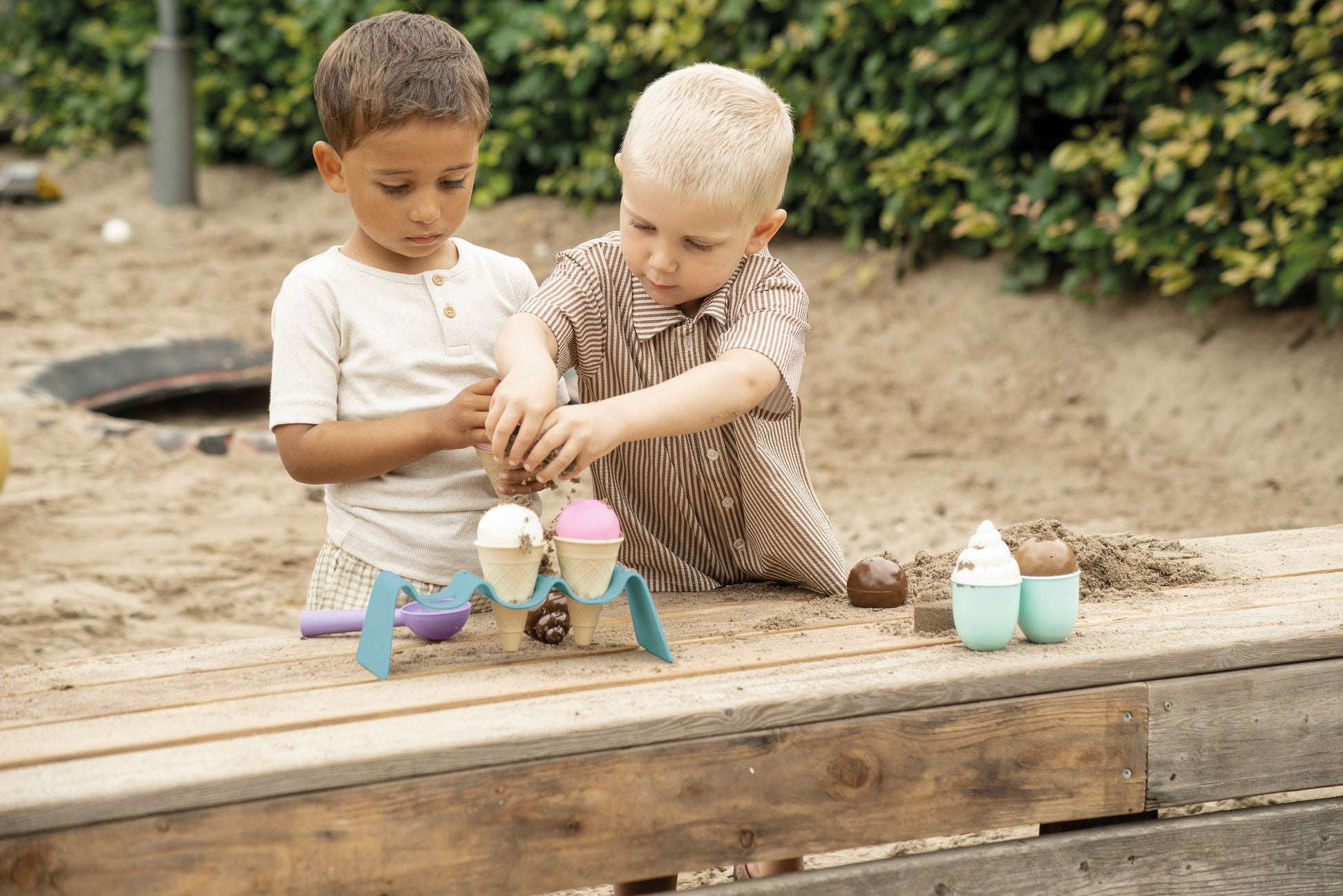 Thorbjørn set mit Eiswaffeln und verschiedenen Toppings, die verschiedene Eissorten repräsentieren. Das Set enthält auch einen Ständer, auf dem Kinder die Eiswaffeln platzieren können, genau wie in einem echten Eisladen. Es wird auch ein Löffel mitgeliefert, um Eisportionen zu formen. Das Set kann sowohl drinnen als auch draußen zum Spielen mit Sand und Wasser verwendet werden.
