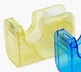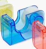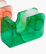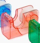 Klebefilmabroller Modell "Golf" in transluzenten Farben rot, gelb, blau und grün bestückt mit jeweils einer Rolle Klebefilm 33m:18mm transparent.