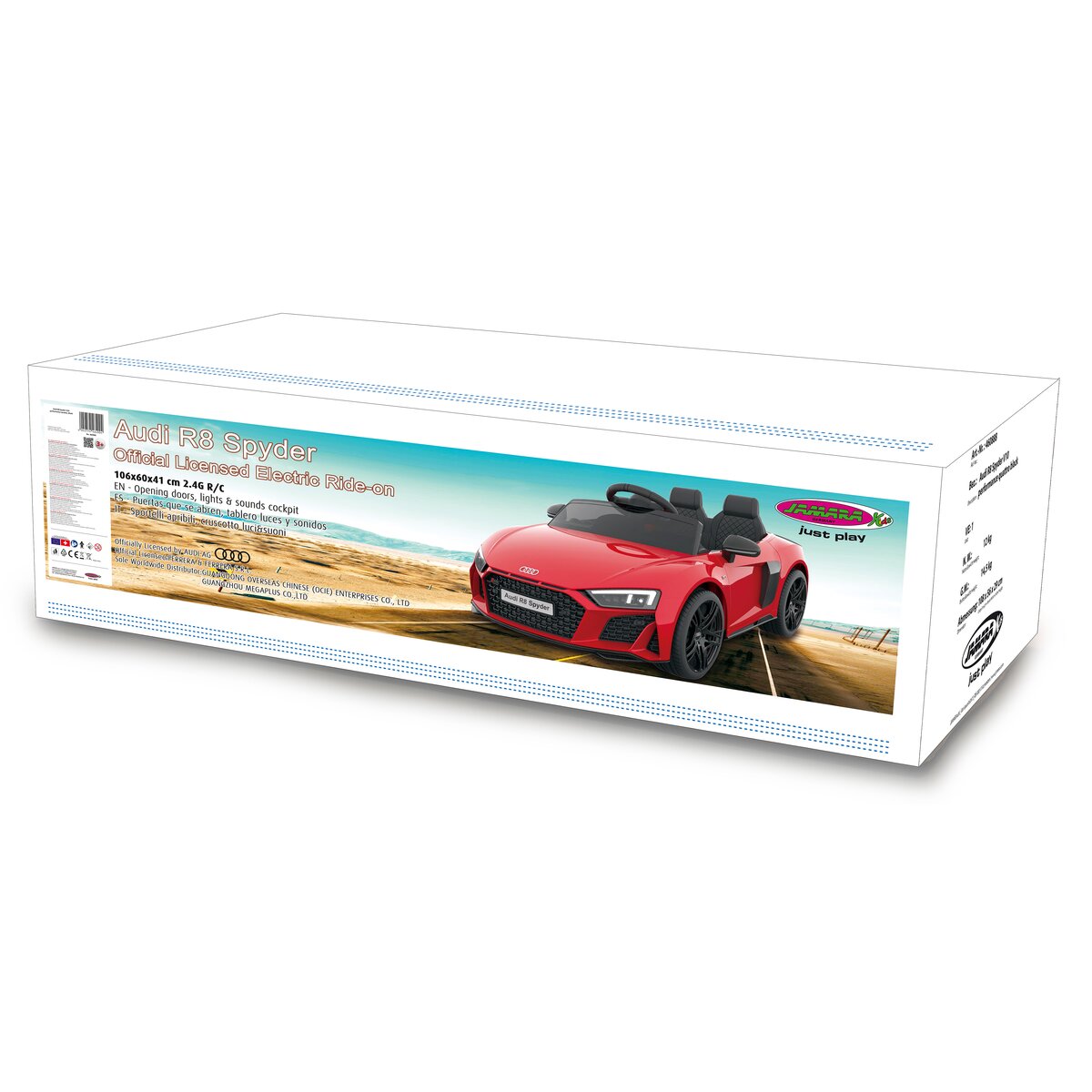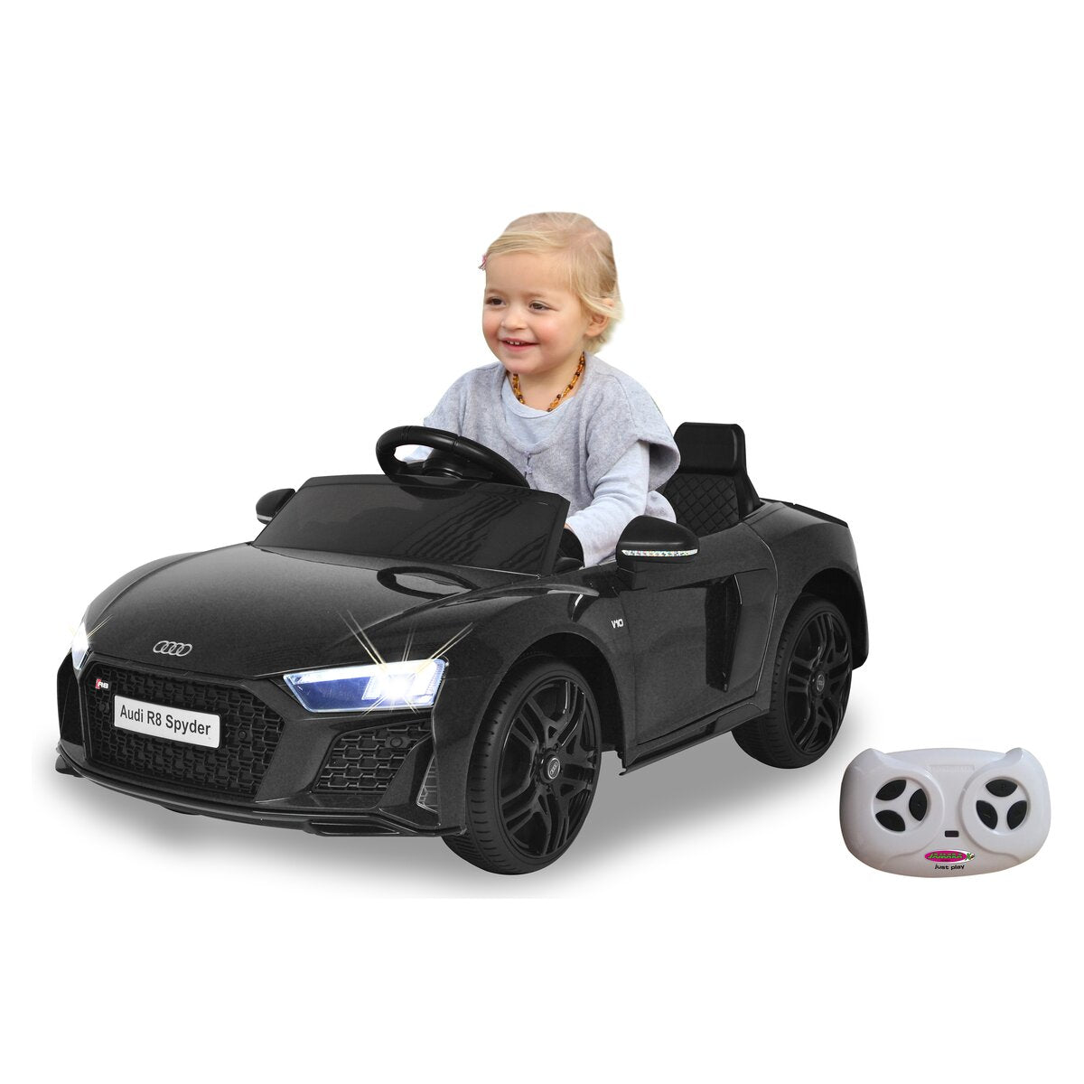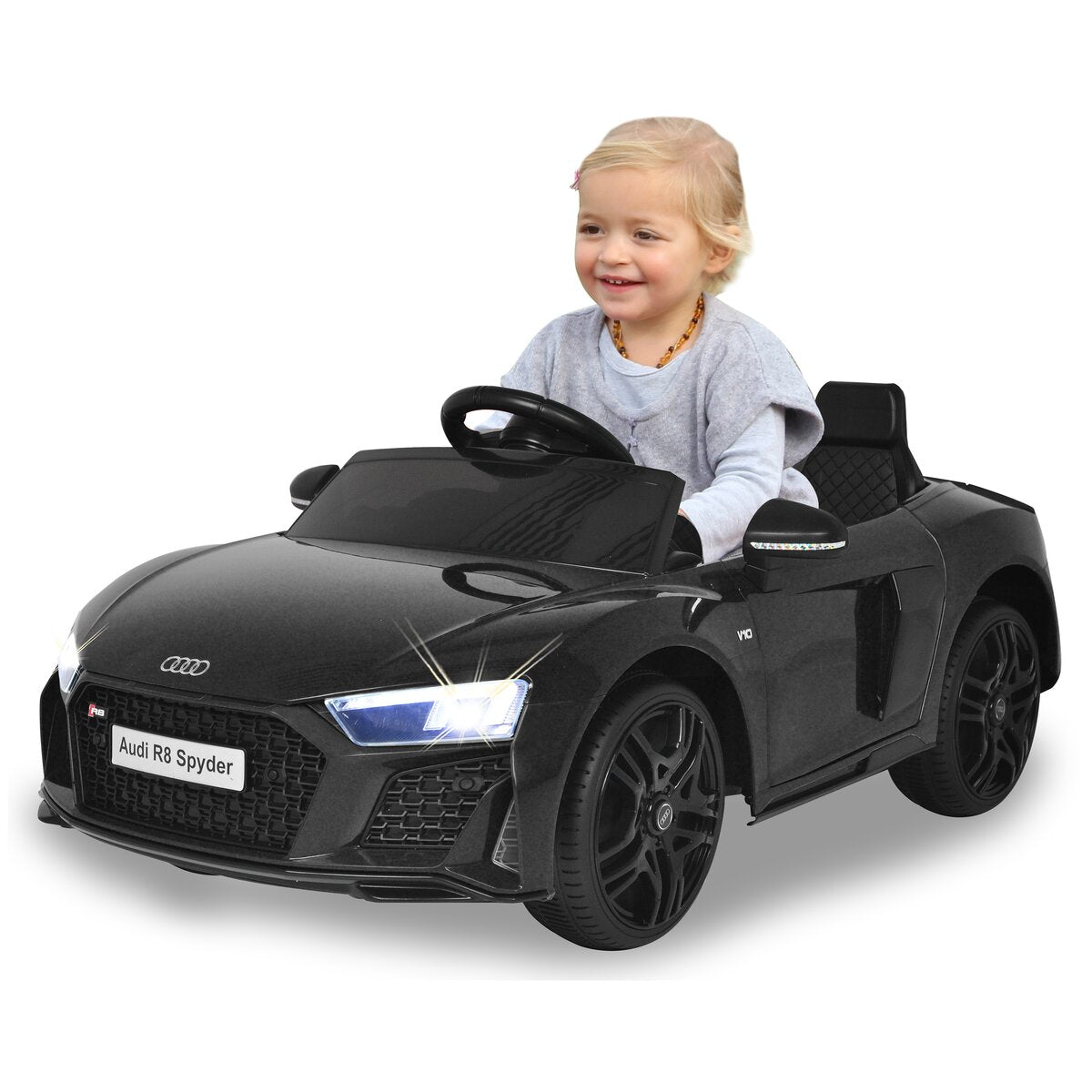 Wer hat nicht schon mal davon geträumt einmal mit einem echten Audi R8 Spyder zu fahren. Jetzt kann dieser Traum wahr werden – mit dem Audi R8 Spyder von Jamara. Einfach an der Steckdose auftanken, einsteigen, Gas geben und los cruisen. Das wird Ihre Kleinen begeistern, und wenn sie die Führung über RC Steuerung übernehmen, kann sich ihr Kind nebenbei voll auf Hupe und Musik am Lenkrad konzentrieren. Mit echten Türen, LED-Licht, Hupe und realistischen Soundeffekten mit USB- und AUX-Anschluss – ist alles verbaut was zum realistischen Spiel dazu gehört. Ein leistungsstarker Motor treibt die Räder des Fahrzeuges an – und mit über einer Stunde Fahrzeit mit nur einer „Tankfüllung“, ist echter Spielspaß garantiert. Erhältlich in drei verschiedenen Farben nur bei JAMARA.